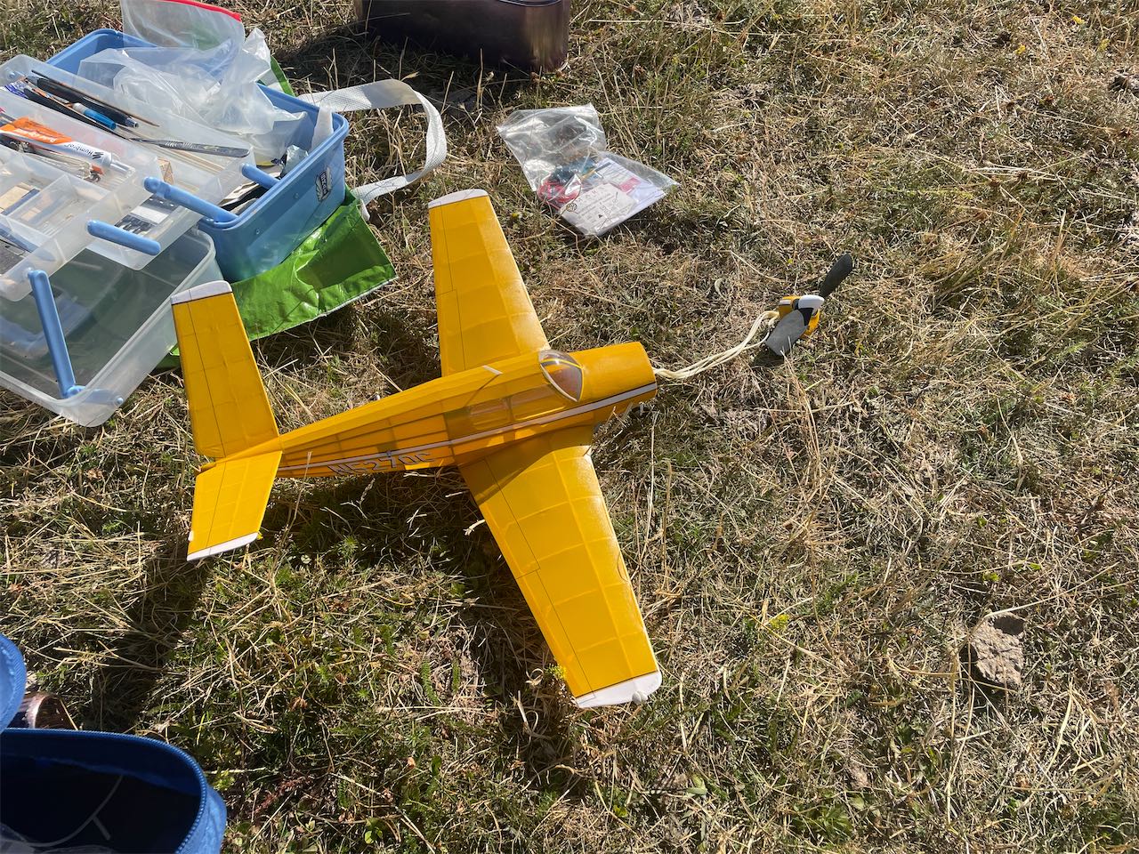 What happened to Ivan’s Auster I hear you asking, well Alan and Gary returned 10 days later after a spell of windy weather to find half of the wing lying on the ground under the tree and the model easily visible having dropped several feet from its original position high in the canopy. The rest of the model was coaxed down with a loop on the end of Alan’s extended carbon fishing pole. Ivan was very pleased to get his model back, only a single wheel remained elusive