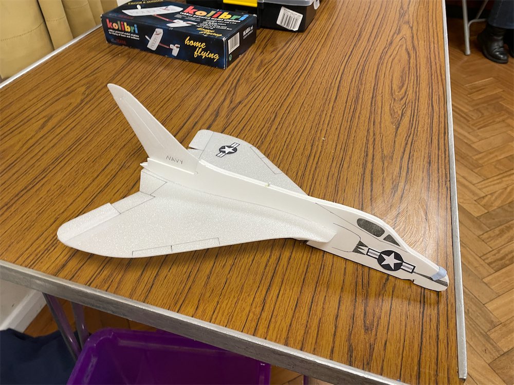 Bob Lee’s Bill Deans F4D Skyray.  Built from foam(Depron & Vectorboard) it weights 10 grams and with its huge wing area it floats across the bedroom.